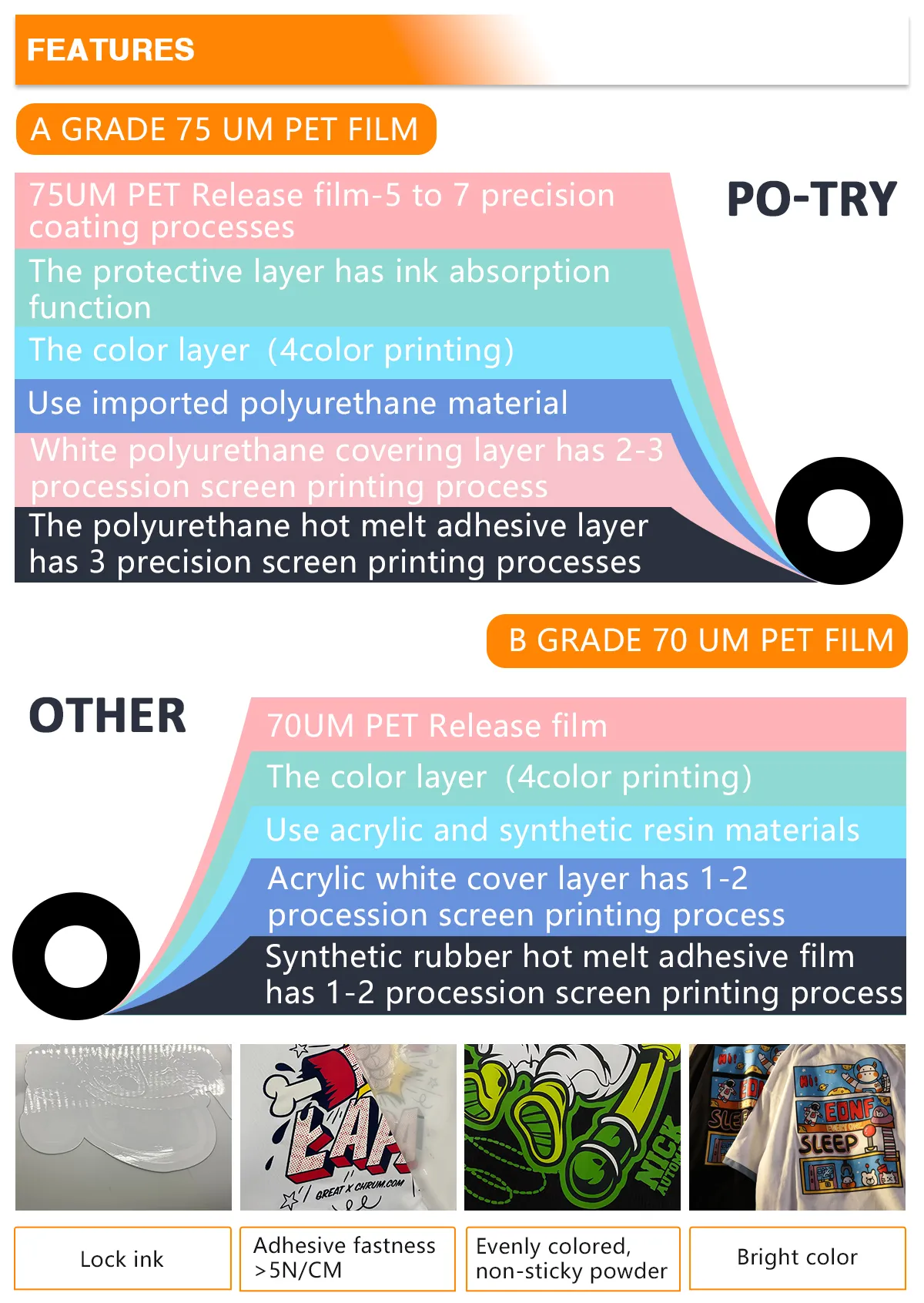 The thickness of the product is no less than 50-120 um, standing stock 75 um, can be customized